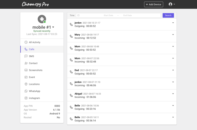 All incoming and outgoing text messages will no longer be a mystery thanks to Chamspy pro's capabilities. It lets you see the number, duration, and timestamp details by simply accessing the call information from your computer.